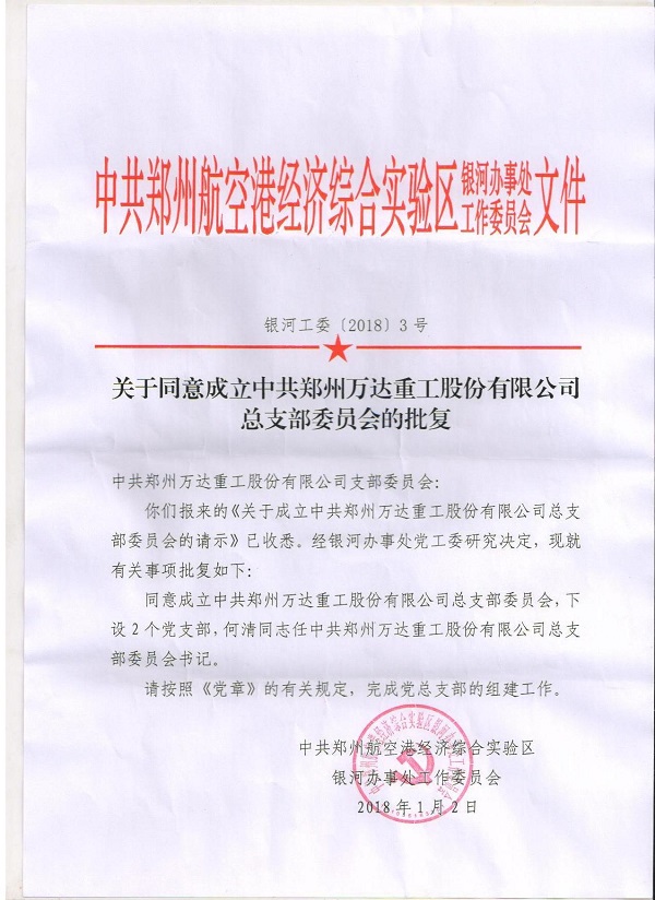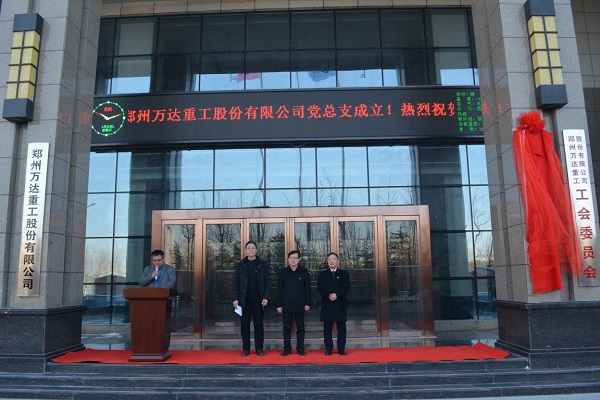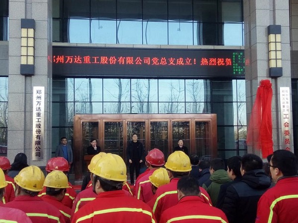 2018年1月10日上午10點(diǎn)整,中共鄭州萬(wàn)達(dá)重工股份有限公司總支部委員會(huì)成立大會(huì)在鄭州萬(wàn)達(dá)重工股份有限公司行政樓前隆重召開(kāi),鄭州航空港經(jīng)濟(jì)綜合實(shí)驗(yàn)區(qū)黨工委組織部程浩部長(zhǎng),銀河辦事處黨工委吳順祥書(shū)記、萬(wàn)達(dá)重工董事長(zhǎng)、書(shū)記何清、公司高管、全體黨員和員工代表參加了此次揭牌成立儀式。