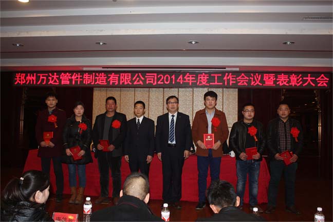 鄭州萬(wàn)達(dá)管件制造有限公司2014年年會(huì)于2015年1月20日隆重召開(kāi)。會(huì)議首先表彰了公司2014年度先進(jìn)工作者、先進(jìn)部門及班組、優(yōu)秀干部、年度進(jìn)步之星、銷售冠軍、優(yōu)秀黨員等十余個(gè)獎(jiǎng)項(xiàng),并對(duì)獲獎(jiǎng)?wù)哳C發(fā)了獎(jiǎng)金和證書。公司董事長(zhǎng)、黨委書記何清同志在會(huì)議上做了題為《適應(yīng)新常態(tài) 開(kāi)創(chuàng)新局面 實(shí)現(xiàn)公司持續(xù)健康穩(wěn)定發(fā)展 》的報(bào)告,總結(jié)了2014年公司的發(fā)展歷程,取得的成績(jī)和不足,展望和部署2015年公司發(fā)展的目標(biāo)和重點(diǎn)工作,為公司全力建設(shè)五位一體的萬(wàn)達(dá)事業(yè)指明了努力方向。公司全體人員中午舉行了盛大的團(tuán)拜招待會(huì),歡聚一堂,其樂(lè)融融。