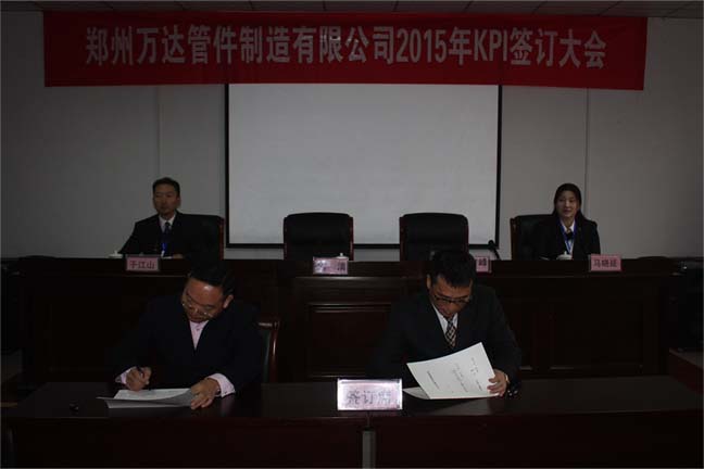 鄭州萬達管件制造有限公司2015年KPI簽訂會于1月30號在公司行政區(qū)會議室隆重舉行,公司班長以上所有管理人員參加了此次簽訂會議。簽訂會分為三級簽訂,即:董事長與總經(jīng)理簽訂、總經(jīng)理與公司各高管簽訂、公司各高管與分管的各部門負(fù)責(zé)人簽訂,近期,各部門負(fù)責(zé)人將部門的KPI指標(biāo)進行分解,與各班組及相關(guān)崗位簽訂目標(biāo)責(zé)任書,達到“千斤重?fù)?dān)人人挑,人人肩上有指標(biāo)”的責(zé)任分解領(lǐng)受,確保最終順利完成公司2015年度各項任務(wù)和目標(biāo)。
