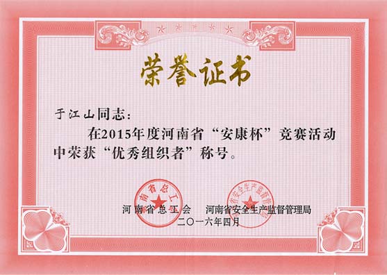 8月16日,河南省總工會(huì)與河南省安全生產(chǎn)監(jiān)督管理局對(duì)2015年度“安康杯”競(jìng)賽先進(jìn)集體和個(gè)人進(jìn)行通報(bào)表彰,鄭州萬(wàn)達(dá)重工股份有限公司繼2014年度獲得河南省“安康杯”后,再次榮獲2015年度省級(jí)“安康杯”競(jìng)賽先進(jìn)單位稱(chēng)號(hào),股份公司工會(huì)主席于江山榮獲河南省“安康杯”競(jìng)賽活動(dòng)“優(yōu)秀組織者”榮譽(yù)稱(chēng)號(hào)。