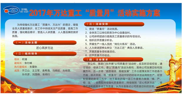 公司于2017年4月1號---4月30號舉辦以“匠心筑夢萬達”為主題的質(zhì)量月活動。為持續(xù)強化萬達重工“質(zhì)量興、萬達興”的理念,增強全員大質(zhì)量觀意識,在工作中持續(xù)關(guān)注產(chǎn)品質(zhì)量,提高工作質(zhì)量,強化精品意識,營造人人講質(zhì)量、人人重品牌的良好氛圍,增強企業(yè)凝聚力和市場競爭力。