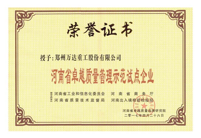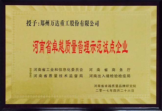 熱烈祝賀鄭州萬達重工股份有限公司榮獲由河南省工業(yè)和信息化委員會、河南省商務(wù)廳、河南省質(zhì)量技術(shù)監(jiān)督局及河南出入境檢驗檢疫局等單位共同指導(dǎo),河南省卓越質(zhì)量品牌研究院組織評選認定的“河南省卓越質(zhì)量管理示范試點企業(yè)”榮譽稱號。