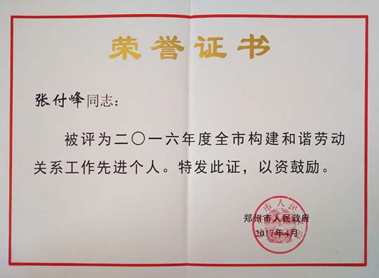 熱烈祝賀鄭州萬(wàn)達(dá)重工股份有限公司總經(jīng)理張付峰同志被鄭州市人民政府評(píng)為“2016年度鄭州市構(gòu)建和諧勞動(dòng)關(guān)系工作先進(jìn)個(gè)人”。