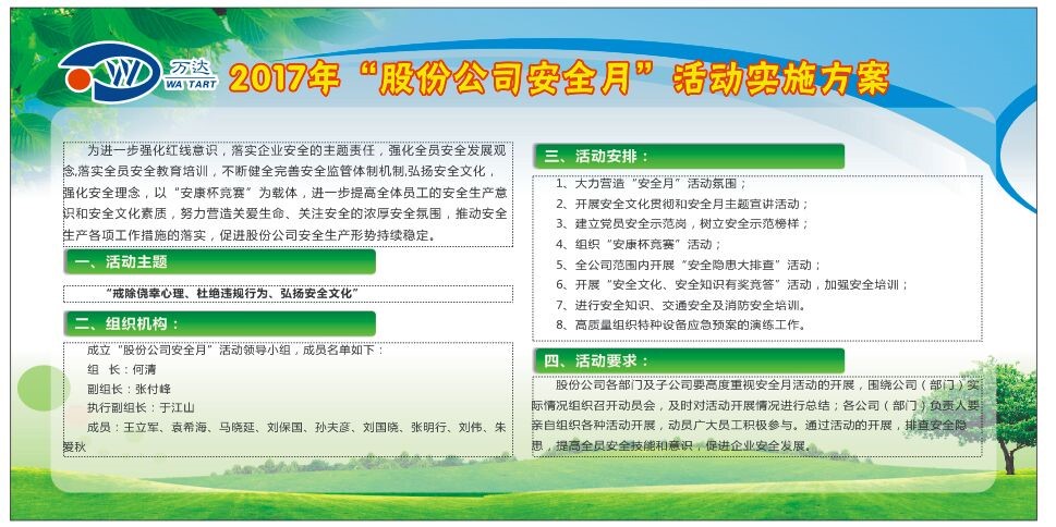 為進一步加大安全生產宣傳力度,強化紅線意識,推動落實企業(yè)安全主題責任,弘揚安全文化,強化安全理念,建設幸福萬達事業(yè),公司特于2017年7月1日—7月31日舉辦以“戒除僥幸心理、杜絕違規(guī)行為、弘揚安全文化”為主題的安全月活動。