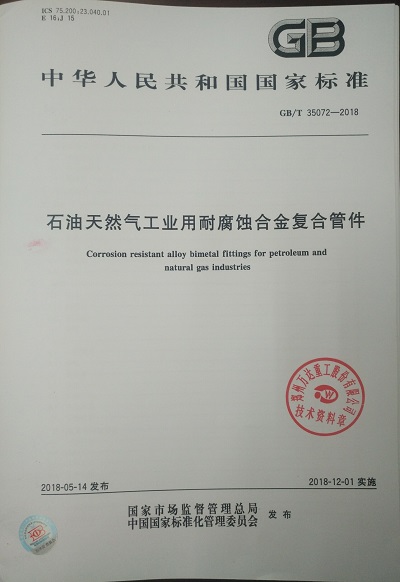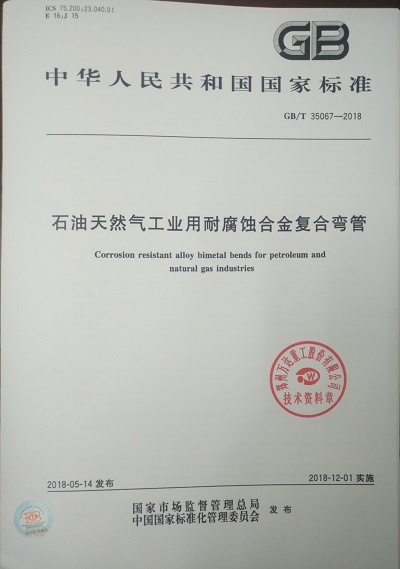 2018年5月14日,國(guó)家市場(chǎng)監(jiān)督管理總局、國(guó)家標(biāo)準(zhǔn)化管理委員會(huì)聯(lián)合發(fā)布了《中華人民共和國(guó)國(guó)家標(biāo)準(zhǔn)公告》【2018年6號(hào)】,鄭州萬(wàn)達(dá)重工股份有限公司參與編制的GB/T35067-2018《石油天然氣工業(yè)用耐腐蝕合金復(fù)合管件》和GB/T35072-2018《石油天然氣工業(yè)用耐腐蝕合金復(fù)合彎管》兩項(xiàng)標(biāo)準(zhǔn)在此次公告之列。