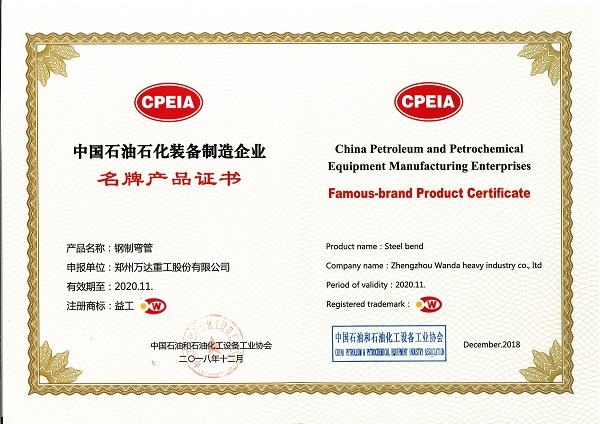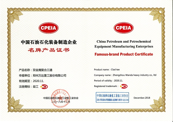 為了更好落實“中國制造2025”的發(fā)展戰(zhàn)略,培育企業(yè)具有科技創(chuàng)新水平的名牌產(chǎn)品,根據(jù)《中國石油石化裝備制造服務行業(yè)名牌產(chǎn)品評價推薦辦法》,按照中石協(xié)秘【2018】14號文的標準評價,萬達重工 “益工”品牌“雙金屬復合三通”和“鋼制彎管”兩種產(chǎn)品被中國石油和石油化工設備工業(yè)協(xié)會評定為“中國石油石化裝備制造企業(yè)名牌產(chǎn)品證書”。