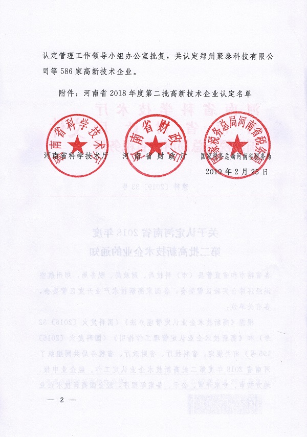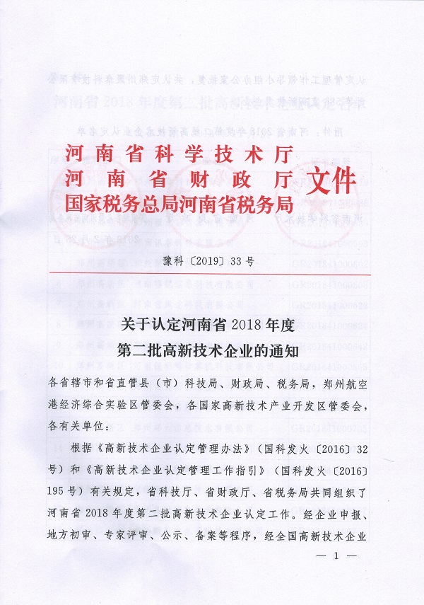 鄭州萬達重工股份有限公司通過了由省科技廳、省財政廳、省稅務(wù)局共同組織的河南省2018年度第二批高新技術(shù)企業(yè)認定,榮獲“高新技術(shù)企業(yè)”稱號。