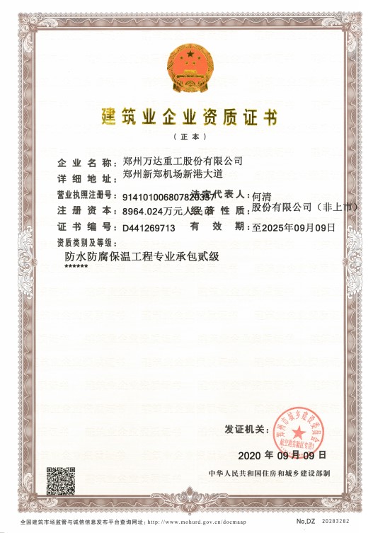 熱烈祝賀鄭州萬達重工股份有限公司順利通過了由鄭州市城鄉(xiāng)建設委員會航空港實驗區(qū)批復的《防水防腐保溫工程專業(yè)承包貳級資質》,證書編號:D441269713,有效期:2020年09月09日至2025年09月09日。
