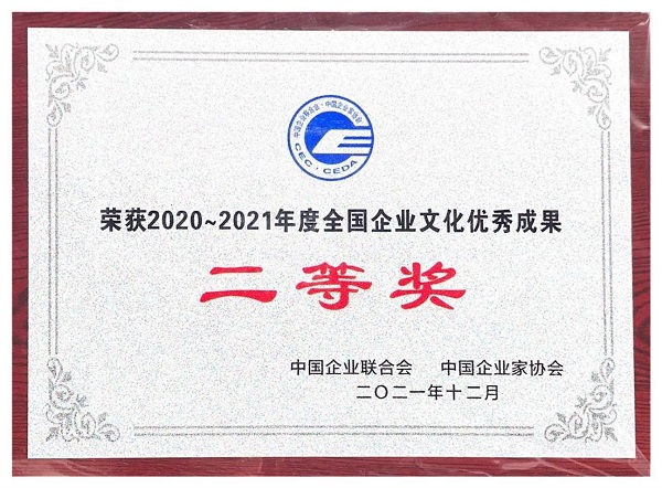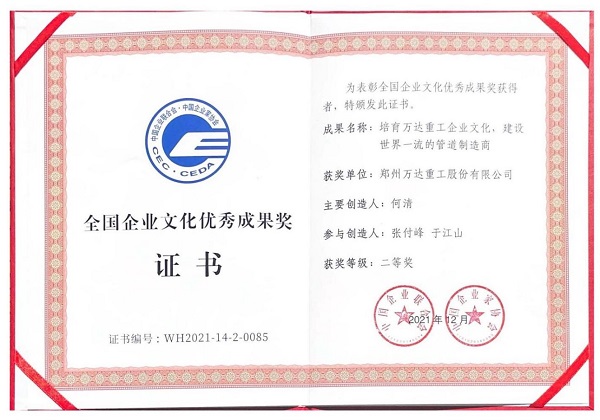 鄭州萬達重工股份有限公司以系統(tǒng)完善的企業(yè)文化體系及卓有成效的企業(yè)文化實踐,榮獲“2020-2021年度全國企業(yè)文化優(yōu)秀成果二等獎”!
