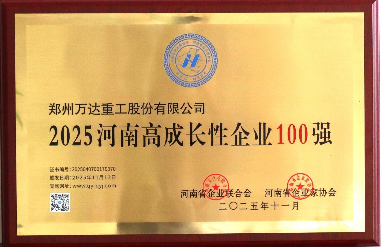 熱烈祝賀鄭州萬達重工股份有限公司連續(xù)榮獲2025河南省高成長性100強企業(yè)
