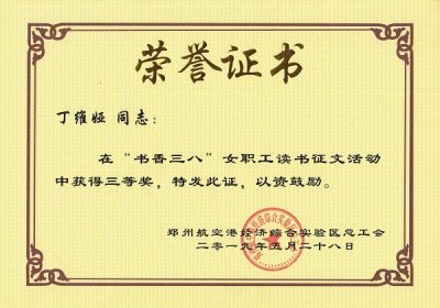 2019/06/11 675 5月28日,鄭州航空港經(jīng)濟綜合試驗區(qū)總工會下發(fā)表彰通知,在全區(qū)女職工中開展的逐夢新時代巾幗綻芳華為主題的書香三八女職工讀書征文活動中,我公司員工丁維婭的作品獲得三等獎,并下發(fā)榮譽證書及鄭州市新華書店購書卡以資鼓勵。 為深入學(xué)習(xí)貫徹習(xí)近平新時代中國特色社會主義思想和黨的十九大精神,引導(dǎo)廣大女職工在閱讀中培育和踐行社會主義...