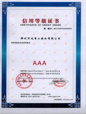 2019/05/07 741 2019年5月7日,河南信用評(píng)估咨詢有限公司簽發(fā)AAA主體信用等級(jí)證書授予鄭州萬達(dá)重工股份有限公司。在2019年的AAA主體信用評(píng)級(jí)中,鄭州萬達(dá)重工股份有限公司順利通過復(fù)審,榮獲AAA信用等級(jí)證書,保持了連續(xù)多年的AAA信用等級(jí)。 我國企業(yè)信用評(píng)估的信用等級(jí)采用國際通行的四等十級(jí)制評(píng)級(jí)等級(jí),具體等級(jí)分為:AAA,AA,...