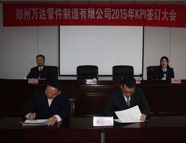 2016/01/28 477 鄭州萬達管件制造有限公司2015年KPI簽訂會于1月30號在公司行政區(qū)會議室隆重舉行,公司班長以上所有管理人員參加了此次簽訂會議。簽訂會分為三級簽訂,即:董事長與總經(jīng)理簽訂、總經(jīng)理與公司各高管簽訂、公司各高管與分管的各部門負(fù)責(zé)人簽訂,近期,各部門負(fù)責(zé)人將部門的KPI指標(biāo)進行分解,與各班組及相關(guān)崗位簽訂目標(biāo)責(zé)任書,達到千...